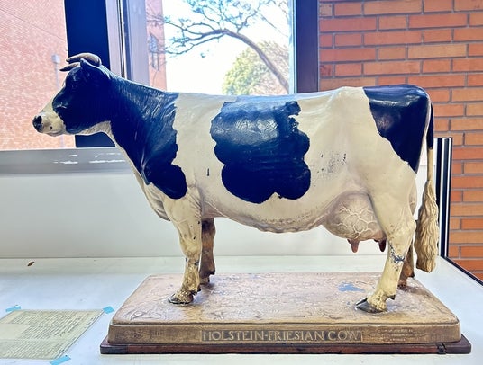 「ホルスタイン牝」:アメリカの酪農家からの依頼で「完全なる乳牛模型」を6年がかりで制作。吾蔵を一躍有名にした作品。右側は国立研究開発法人 農業・食品産業技術総合研究機構(農研機構)からお借りする、100年前に制作され日本に渡った理想の乳牛像(着色)