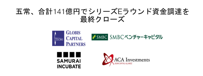 五常は、2022年11月の70億円のシリーズEラウンド資金調達、2023年1月の海外需要開拓支援機構からの30億円の同ラウンド追加調達に続いて、合計41億円のシリーズEラウンド最終クローズを実施しました。グロービス・キャピタル・パートナーズ株式会社、SMBCベンチャーキャピタル株式会社などの新規機関投資家および個人投資家の参画に加えて、既存株主である株式会社サムライインキュベート、ACA Investments Pte. Ltd.等の投資家からの追加的な資金調達を、E2種およびE4種優先株式により実施しました。