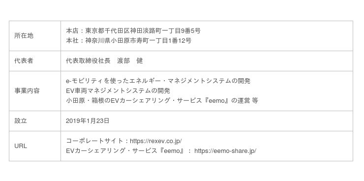 電気自動車(以下、EV)を使ったカーシェアリング“eemo”並びにエネルギーマネジメントに取り組むEnergy Tech の株式会社REXEV(本店:東京都千代田区、代表取締役社長:渡部健、以下、REXEV)と小田急電鉄株式会社(本社所在地:東京都新宿区、取締役社長:星野 晃司、以下、小田急電鉄)は、小田原の地域交通の活性化を目指しMaaS領域でサービスの連携を開始します。