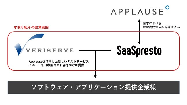 ベリサーブは、機能・システム製品品質における検証会社として、SaaSprestoは、「Applause」の国内総販売代理店として、2社協業により日本国内のソフトウェア・アプリケーション提供企業様に向け、新しいテストサービスメニューを提供してまいります。