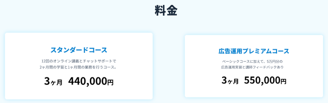 マーケティングの総合的に学ぶことができる「スタンダードコース(受講期間:3ヶ月、受講料:税込440,000円)」と、広告運用まで学ぶことができる「広告運用プレミアムコース(受講期間:3ヶ月、受講料:550,000円税込)」の2種類を提供します。