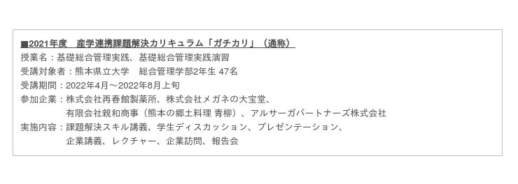 株式会社再春館製薬所(本社:熊本県上益城郡益城町、代表取締役社長:西川正明、以下 再春館製薬所)は、公立大学法人熊本県立大学(所在地:熊本市東区月出、学長:堤裕昭、以下 熊本県立大学)、一般社団法人フミダス(所在地:熊本市東区三郎、代表理事:濱本伸司、以下 フミダス)と共に2018年度より総合管理学部で開講している、産学連携課題解決カリキュラム「ガチカリ(通称)」が今年もスタート致します。