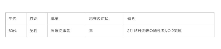 2月15日報道発表「都内患者(2月13日判明)の積極的疫学調査の現在の実施状況(第2報)」でお知らせした陽性者に係る濃厚接触者の検査により、1名が陽性と判明し、速やかに医療機関に搬送、入院する予定です。