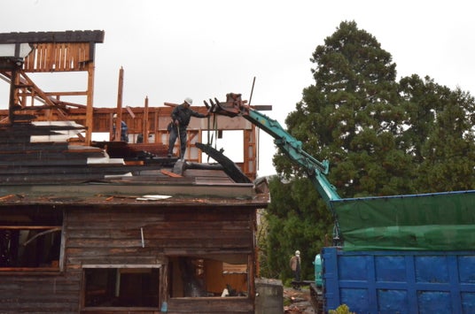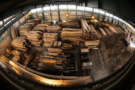 新潟県の古民家を解体する様子。20本ほどの古木が買い取られ古民家の情報と共に大町倉庫に保管されています。
