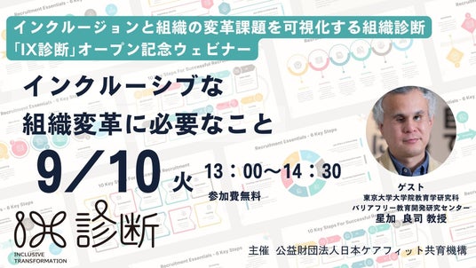公益財団法人 日本ケアフィット共育機構(本社:東京都千代田区 代表理事:畑中 稔 以下、ケアフィット)は 2024 年9月より、インクルージョンと組織変革の課題を可視化する組織診断「IX 診断」のサービスを開始します。 これに先立ち、「IX診断」オープン記念として、「IX診断」共同開発責任者である、東京大学大学院教育学研究科附属 バリアフリー教育開発研究センターの星加良司教授をゲストに「インクルーシブな組織変革に必要なこと」をテーマに したウェビナーを開催いたします。