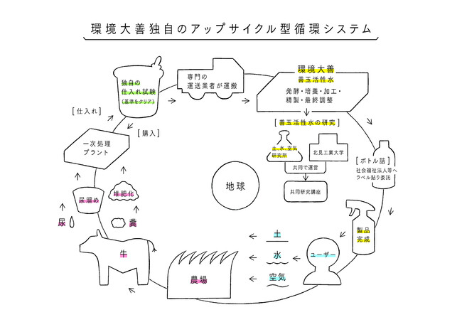 この循環は、酪農家から牛の尿を購入し地域経済を循環させるだけでなく、製品の消費者も自動的に環境危機の解決へ加わる事になり、善の循環を起こす事ができます。