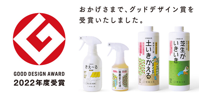 この度、私たちが製造・販売する消臭液「きえ~る」、土壌改良材「液体たい肥 土いきかえる」「芝生がいきいき」、植物保護液「無農薬への道」が「ブランディング・CI/VI」部門で2022年度グッドデザイン賞を受賞いたしました。