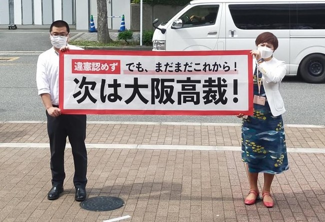 大阪地裁民事第11部(土井文美・神谷善英・関尭熙の各裁判官が構成する裁判体)が下した合憲判決を受けて横断幕を掲げる関西訴訟弁護団メンバー