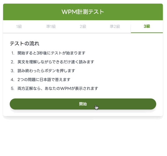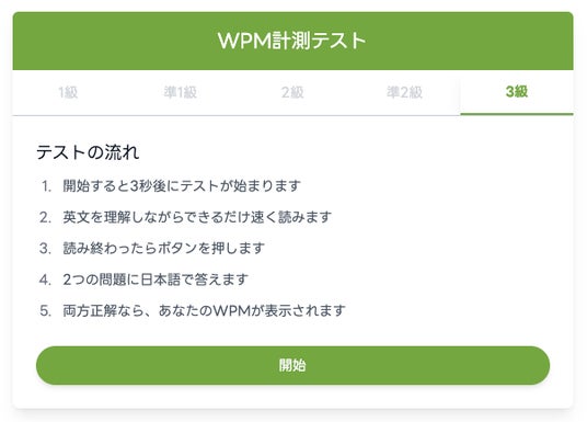 ・ WPM計測テスト(英検(R)3級レベル): https://apps.studystudio.jp/wpm-test