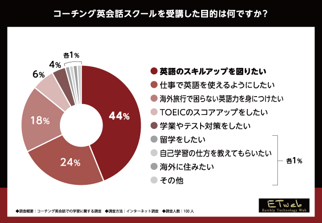 コーチング英会話スクールを受講した目的として「英語のスキルアップを図りたい」が最多の回答に