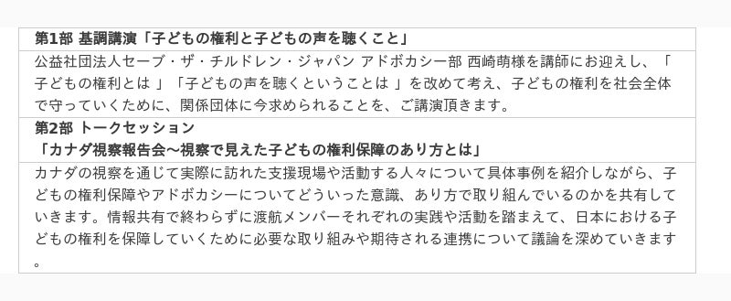 本イベントでは、セーブ・ザ・チルドレン・ジャパンの西崎萌氏をお迎えし、改めて「こどもの権利」と日本の現状や、関係団体に今求められることは何かを講演いただき、その後、カナダの現場で実践されている先進事例をご紹介しながら、NPO、行政、メディア、中間支援団体などそれぞれの立場を活かして何ができるかをトークセッション形式で考えていきます。