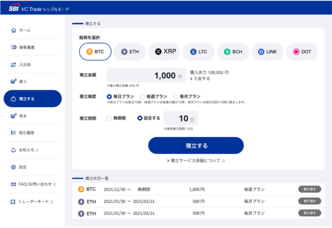 ・暗号資産の購入や積立の設定に特化した画面構成