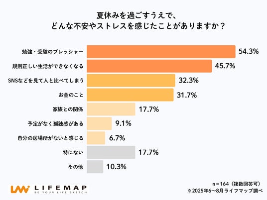「夏休みを過ごすうえで、どんな不安やストレスを感じたことがあるか」と聞いたところ、最も多かったのが「勉強・受験のプレッシャー」(54.3%)でした。次いで「規則正しい生活ができなくなる」(45.7%)、「SNSを見て人と比べてしまう」(32.3%)、「お金のこと」(31.7%)が続きました。また、「家族との関係」(17.7%)や「予定がなく孤独感がある」(9.1%)、「自分の居場所がないと感じる」(6.7%)といった家庭や人間関係に関する不安も一定数見られ、学習面や生活面に加え、SNSや家庭環境、孤独感など、多方面でストレスや不安が存在することがわかりました。