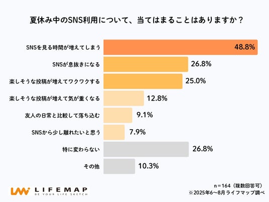 夏休み中のSNS利用について聞いたところ、最も多かったのは「SNSを見る時間が増えてしまう」(48.8%)でした。次いで「SNSが息抜きになる」(26.8%)や「楽しそうな投稿が増えてワクワクする」(25.0%)といったポジティブな回答が続きました。一方で、「楽しそうな投稿を見て気が重くなる」(12.8%)、「友人の日常と比べて落ち込む」(9.1%)、「SNSから少し離れたいと思う」(7.9%)といった回答から、SNS疲れの影響も確認されました。夏休み中のSNS利用は、高校生にとって楽しみや息抜きの場であると同時に、周囲との比較や気疲れの要因にもなっており、その二面性が浮かび上がる結果となりました。