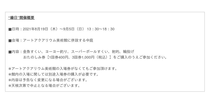 アートアクアリウム製作委員会(代表執行組合員:株式会社AmuseumParks)は8月19日から9月5日までアートアクアリウム美術館に隣接する中庭で「縁日」を開催致します。