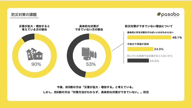セコム株式会社が2022年8月に実施した「防災に関する意識調査」によると、回答者の約5割の方が何も対策できていないことが明らかとなっています。その理由として「具体的にどのような対策を始めていいかわからない」「対策のための準備が面倒」などの理由があげられており、pasoboはこうした防災意識を改革する目的で提供されます。