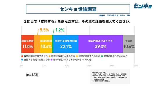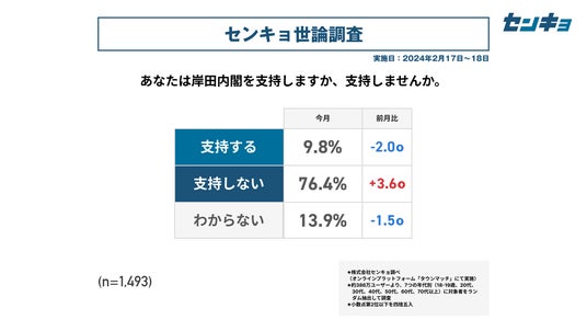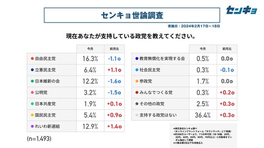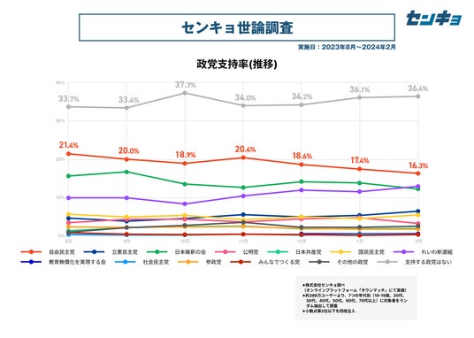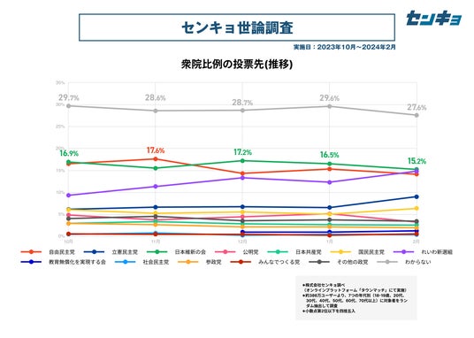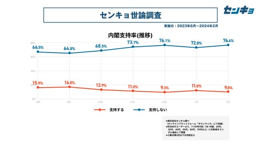 株式会社センキョ(所在地:東京都港区、代表取締役:堀 浩之)は、2023年8月より毎月、自社で運営する全国386万人余りの市民が参加するプラットフォーム「タウンマッチ」において、内閣の支持率や政党の支持率などを調査する「世論調査」を実施しています。政治に関する新たな調査データとして、政治関係者や有識者だけではなく、幅広く多くの方にご活用いただけますと幸いです。