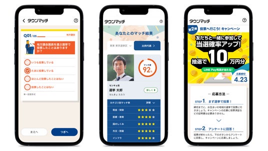 タウンマッチは、386万人のユーザーと自治体、政治家、メディア、企業、団体等をゆるやかにつなぐ次世代のプラットフォームです。市民は自らのまちの自治体や政治家などへ意見や思いを届けるアンケートに参加したり、国政選挙で候補者と自分の政策についての考え方の一致度を測るボートマッチなどのサービスを無料で利用することができます。