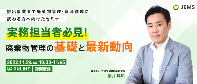「ITで環境問題に挑む」をコーポレートスローガンに掲げる株式会社JEMS(本社:茨城県つくば市、代表取締役:須永裕毅)は、2022年11月29日(火)に排出事業者の廃棄物管理担当者様向けに、廃棄物管理の基礎や法改正などの最新動向を解説する無料のオンラインセミナーを開催します。