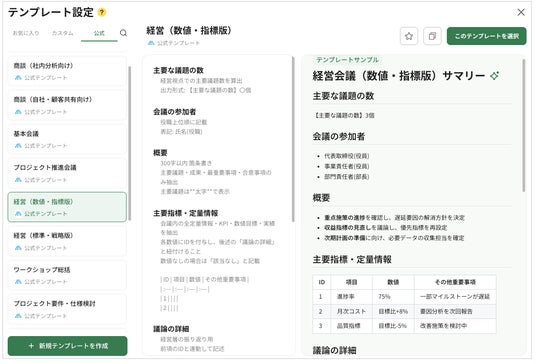 商談、経営会議、開発会議、面接など、各シーンに対応した15タイプの公式テンプレートを、会議ログ画面において選択できるようになりました。複雑な設定は不要で、テンプレートを選んで要約ボタンを押すだけで、数分で要約結果が出力されます。テンプレートの選択画面では要約サンプルを確認できます。