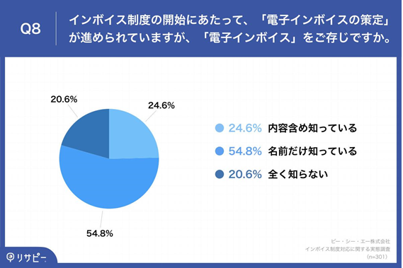 「Q8.インボイス制度の開始にあたって、「電子インボイスの策定」が進められていますが、「電子インボイス」をご存じですか。」(n=301)と質問したところ、「内容含め知っている」が24.6%、「名前だけ知っている」が54.8%という回答となりました。