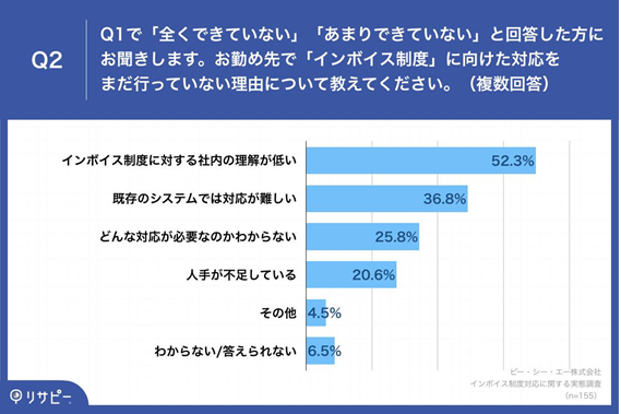 「Q2.Q1で「全くできていない」「あまりできていない」と回答した方にお聞きします。お勤め先で「インボイス制度」に向けた対応をまだ行っていない理由について教えてください。(複数回答)」(n=155)と質問したところ、「インボイス制度に対する社内の理解が低い」が52.3%、「既存のシステムでは対応が難しい」が36.8%、「どんな対応が必要なのかわからない」が25.8%という回答となりました。