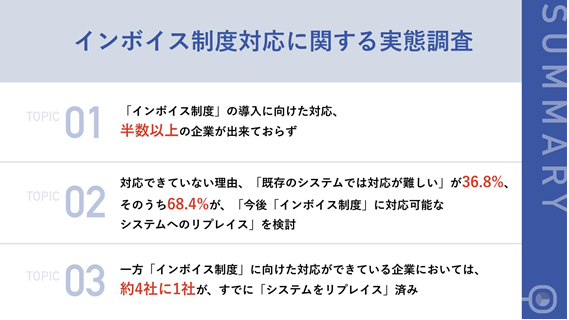 今回の調査で、2023年10月1日の開始まで残り約1年半となった「インボイス制度」に対して、理解が広がっていないことや、システムが対応していないことが原因で、半数以上の企業で未だ導入に向けた対応ができていない実態が明らかになりました。一方で、今後「インボイス制度」に対応可能なシステムへのリプレイスを検討している企業や、「電子インボイス」制度の活用を予定している企業が多くいることからも、情報を持っている企業は続々と対応に向けて動き出している現状が窺えました。「インボイス制度」に対して、理解が広がっていない場合、システムが対応していない場合は、社内全体での情報収集を早めに行うだけでなく、社内チームでの連携を取りシステム等の準備を進めていき、「インボイス制度」に対応する必要があると言えるでしょう。