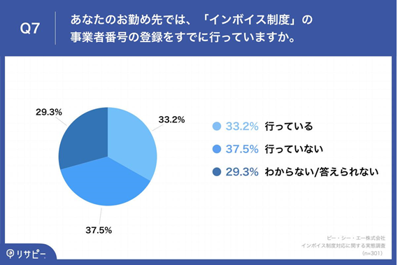 「Q7.あなたのお勤め先では、「インボイス制度」の事業者番号の登録をすでに行っていますか。」(n=301)と質問したところ、「行っている」が33.2%、「行っていない」が37.5%という回答となりました。