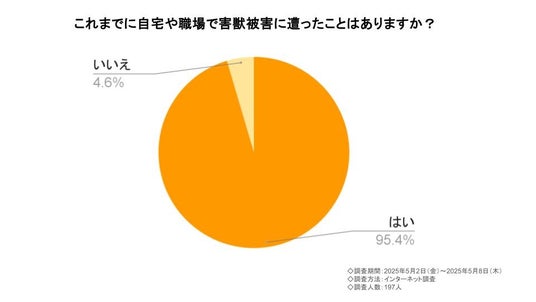 まず「これまでに自宅や職場で害獣被害に遭ったことはありますか?」(n=197)と質問したところ、188名(95.4%)から「はい」、9名(4.6%)から「いいえ」という回答が得られました。このことから、約9割の方が害獣被害に遭ったことがうかがえます。