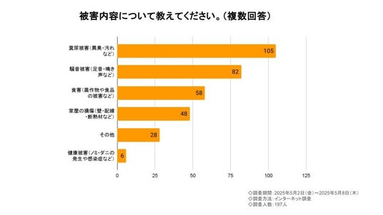 また、「食害」は58件、「家屋の損傷」は48件の回答があり、農作物や食品の被害、さらには壁や配線の損傷なども確認されています。