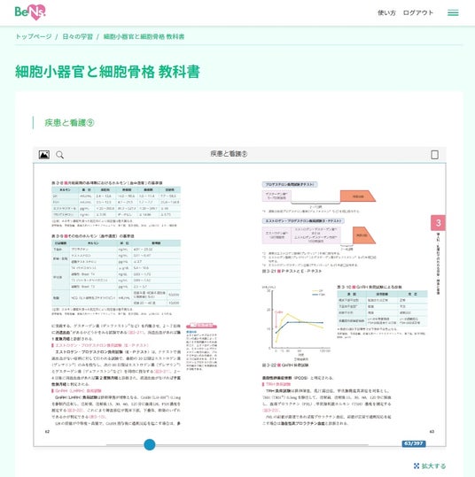 今回は52 冊の教科書のPDF をbookend view に登録し、bookend view の閲覧ページ指定機能を使って約2,000種類にマイクロコンテンツ化したうえで、「BeNs.(ビーナス)」サイト内にbookend view のビューアを組み込むことで、各学習者に最適な教科書コンテンツを提供可能にしています。