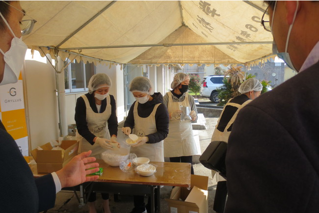 災害時に避難所運営の協力や自社商品の提供、コオロギパウダー入り缶入りパンの贈呈も