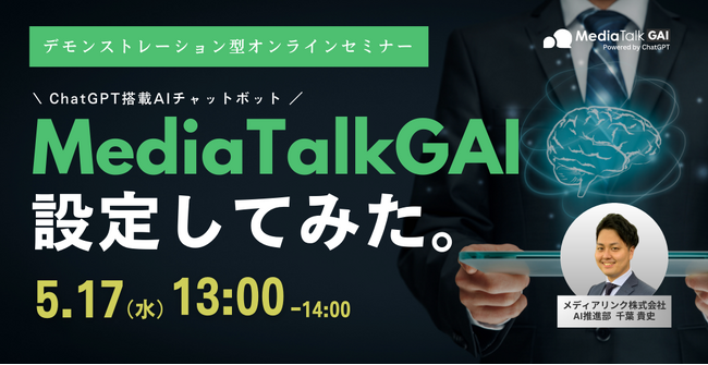ChatGPT搭載AIチャットボット「MediaTalkGAI」や、代表電話を自動化する「DXでんわ」などを提供するメディアリンク株式会社(本社: 東京都港区、代表取締役:松本 淳志、以下 メディアリンク)は、「MediaTalkGAI」の設定デモンストレーションを行うWebセミナーを5/17(水)13:00~開催いたします。