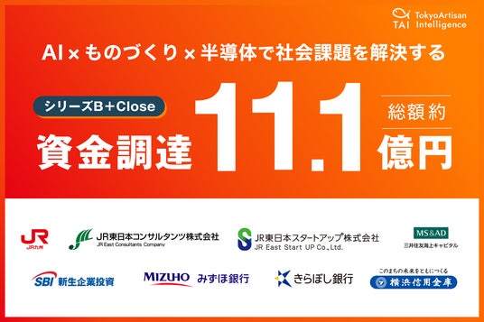 Tokyo Artisan Intelligence株式会社(本社:神奈川県横浜市、代表取締役:中原啓貴(CEO,CTO)、岡安一将(COO)、以下:TAI)は、JR東日本コンサルタンツ株式会社(本社:東京都品川区、代表取締役社長 大西精治、以下:JR東日本コンサルタンツ)と九州旅客鉄道株式会社(本社:福岡県福岡市、代表取締役社長執行役員 古宮洋二、以下:JR九州)と資本業務提携を締結し、追加資金調達を実施し、総額約11.1億円の資金調達を完了しました。