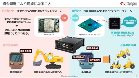 しかし、顧客が要望する次世代システムにおけるAI処理は非常に重く、発熱による問題が課題になると予想されます。今回の資金調達を行い、FPGA (Field Programmable Gate Array: 現場で書き換えられる半導体チップ)に代表される再構成可能技術 (Reconfigurable Technology)を適用したエッジAI向け再構成可能な半導体チップを設計・製造し「SEASIDE」の次世代プラットフォームに搭載します。
