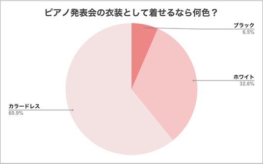続いて、「ピアノ発表会の衣装として着せるなら何色か」を調査したところ『カラードレス(60.9%)』と回答した方の割合が最も多く、次いで『ホワイト(32.6%)』、『ブラック(6.5%)』と続きました。