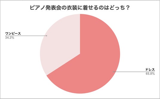 まず、「ピアノ発表会の衣装に着せるのはドレスとワンピースどっち?」と質問したところ、『ドレス(65.8%)』と回答した方が最も多く、次いで『ワンピース(34.2%)』と続きました。