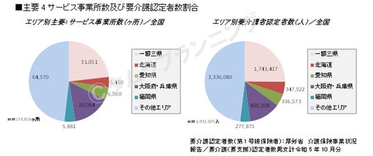 一方、主要4サービスの事業所数をエリア別で比較すると、一都三県、北海道、愛知県、大阪府・兵庫県、福岡県など主要都市部のエリアで全国の半数を超えている。これは同エリアにおける要介護認定者数の割合とほぼ一致しており、今後、都市部において要介護認定者数が増加するに従い、主要4サービス事業所数の割合も増していくことが見込まれる。