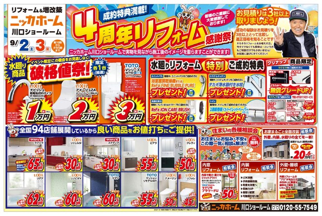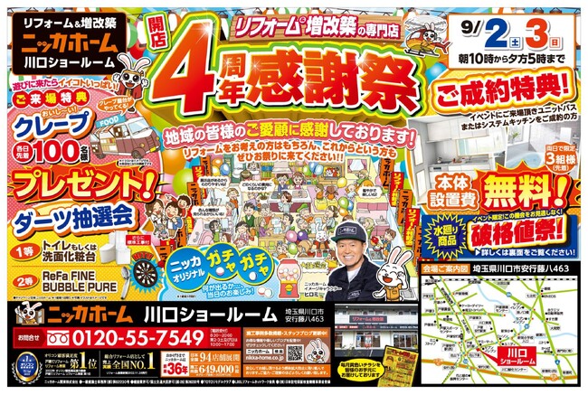 リフォーム&増改築の”ニッカホーム川口ショールーム”が周年感謝祭を開催します!この秋、お得にリフォームができるチャンス!9/2(土)・3(日)の2日間は、ニッカホームショールームイベントで決まりだ!
