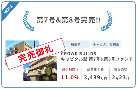 株式会社フィンスターが運営する不動産クラウドファンディングサービス「CROWD BUILDS」にて、FINSTAR AGENTからの組成を記念したキャンピタル型第7号および第8号ファンドが多数の応募により完売したことをご報告いたします。