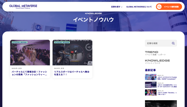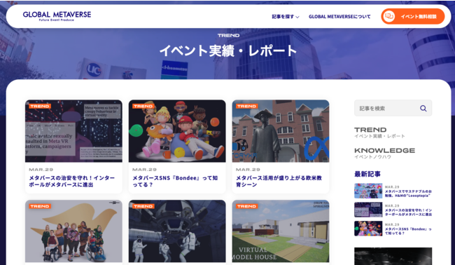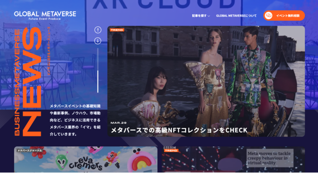 グローバルメタバース公式サイトでは、メタバースイベントの基礎知識や最新事例、ノウハウ、市場動向、メタバースニュースなど、ビジネスに活用できるメタバース業界の「イマ」をご紹介していきます。
