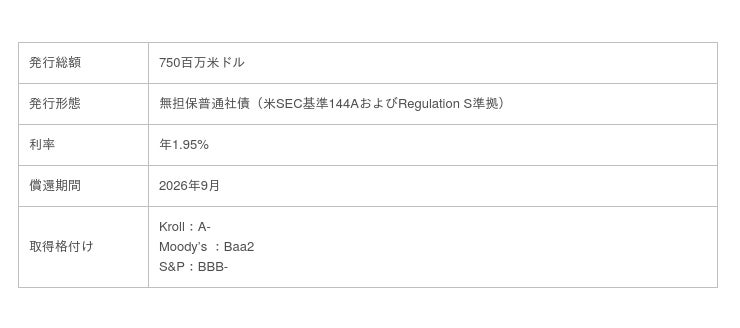 ※本発表文は、当社海外子会社の証券発行に関する情報を一般に公表するために作成されたものであり、日本国内外を問わず一切の投資勧誘またはそれに類する行為を目的として作成されたものではありません。また、本発表文は、米国内外を問わず、いかなる証券の取得の申込みの勧誘または売付けの申込みもしくは買付けの申込みの勧誘を構成するものではありません。上記の証券は 1933年米国証券法に基づき登録されたものでも、また今後登録されるものでもなく、同法に基づいて上記の証券の登録を行うかまたは登録の免除を受ける場合を除いて、米国において募集または販売を行うことは許されません。なお、本件においては、米国において証券の公募は行われません。