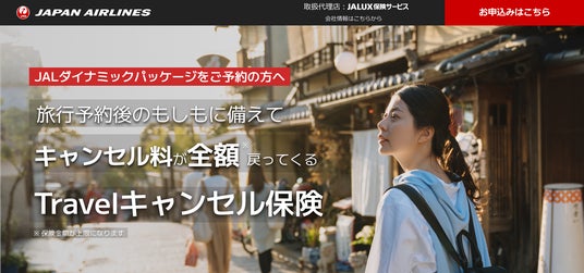 JALグループの商社である株式会社JALUX(本社:東京都港区、代表取締役社長:高濱 悟、以下「JALUX」)と損害保険ジャパン株式会社の子会社で少額短期保険業を営むMysurance(マイシュアランス)株式会社(本社:東京都新宿区、代表取締役社長:桐山 正弘、以下「Mysurance」)は、国内向けのパッケージツアー「JALダイナミックパッケージ※1」のご予約時に、キャンセル料を全額補償する「Travelキャンセル保険※2」の案内を開始しました。