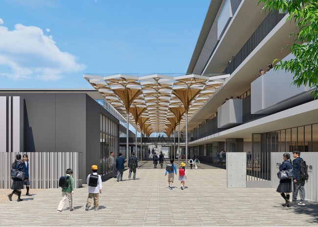 東門と西門をつなぐ場所にあって、大きな屋根を架けることで学校と地域がつながり、交流する拠点として活用できます。北側には地域協働ラボや体育館、児童クラブを配置し、南側には教室などの校舎を配置します。