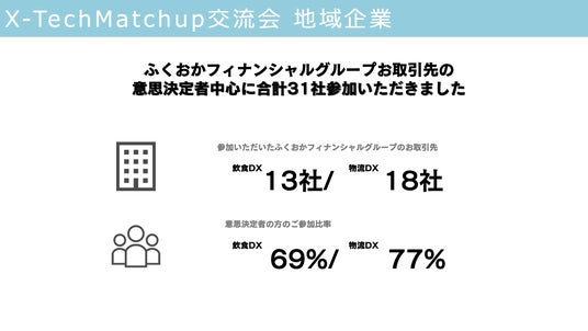 株式会社ふくおかフィナンシャルグループ(取締役社長 五島 久、以下「ふくおかフィナンシャルグループ」) 傘下の株式会社FFGベンチャービジネスパートナーズ(代表取締役社長 吉田 泰彦、以下「FVP」)は、スタートアップと地域企業のネットワーキングイベント『 X-Tech Match up(クロステックマッチアップ) 交流会 飲食DX&物流DX』を開催致しました。