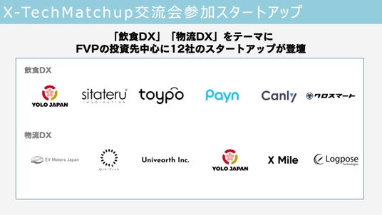 「飲食DX」「物流DX」をテーマに、FVPの投資先を中心に日本全国から12社のスタートアップに参加いただきました。