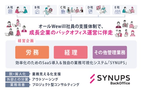 Wewillが提供する「SYNUPS BackOffice」は、単なるツール提供や外部委託に留まらない統合型BPaaSとして、顧客のバックオフィス運営そのものに伴走します。中核となる独自SaaS「SYNUPS」による業務の徹底的な可視化と分業管理の仕組み、そしてWewill社員による高品質な業務運営・改善支援を組み合わせることで、属人化や人材不足といった成長企業が抱えがちなバックオフィスの構造的課題の解決を図ります。これまで累計100社を超える企業への支援を通じて蓄積してきた豊富な業務ノウハウを基に、お客様の成長フェーズや事業特性に最適化されたバックオフィス業務の設計から日々の運営までを、全て弊社の支援体制でサポートします。