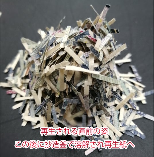 シュレダー?された元紙幣は、洗濯しても溶けませんね!なのでそのままの姿が再生紙の中に残っております。