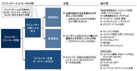 本調査では、クリエイターエコノミー市場を、クリエイター活動による収入(間接課金・直接課金)と、クリエイター支援サービスへの支出をあわせたものとして定義しています。