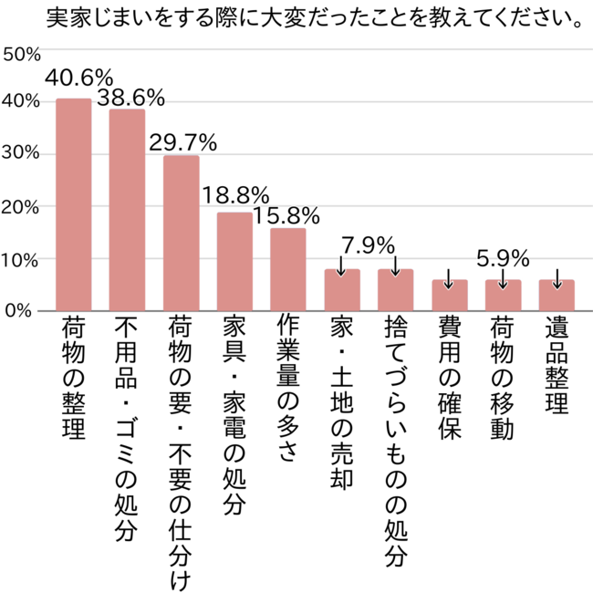 最も多かったのは「荷物の整理(40.6%)」で、それに伴う「不用品・ゴミの処分(38.6%)」・「家具・家電の処分(18.8%)」や、処分等のための「荷物の移動(5.9%)」が大変だったという声が多く聞かれました。不用品を処分するだけでも思ったよりお金がかかり「費用の確保(5.9%)」が大変なことも多いようです。